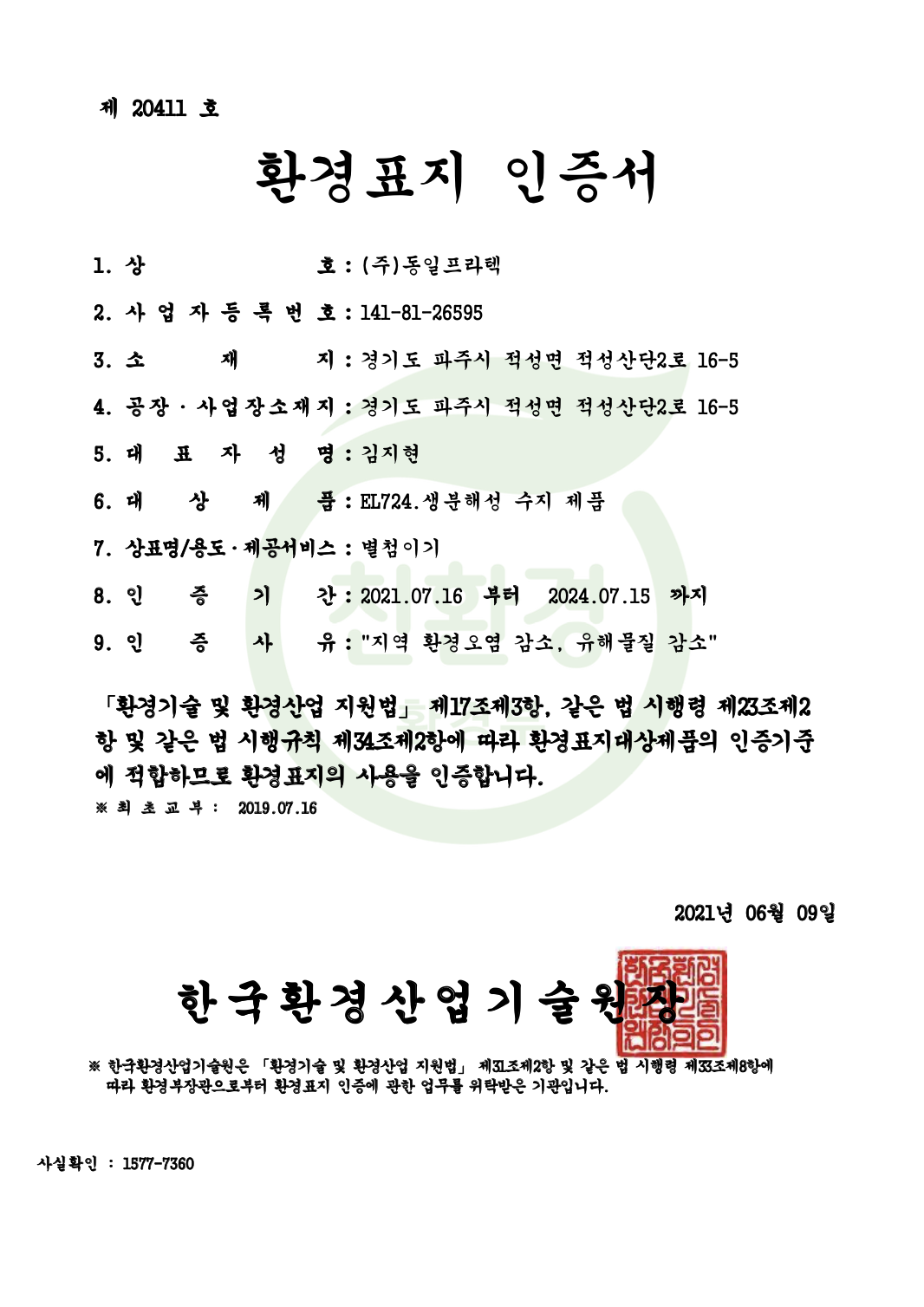 Certification Body: Korea Institute of Environmental Industry and Technology